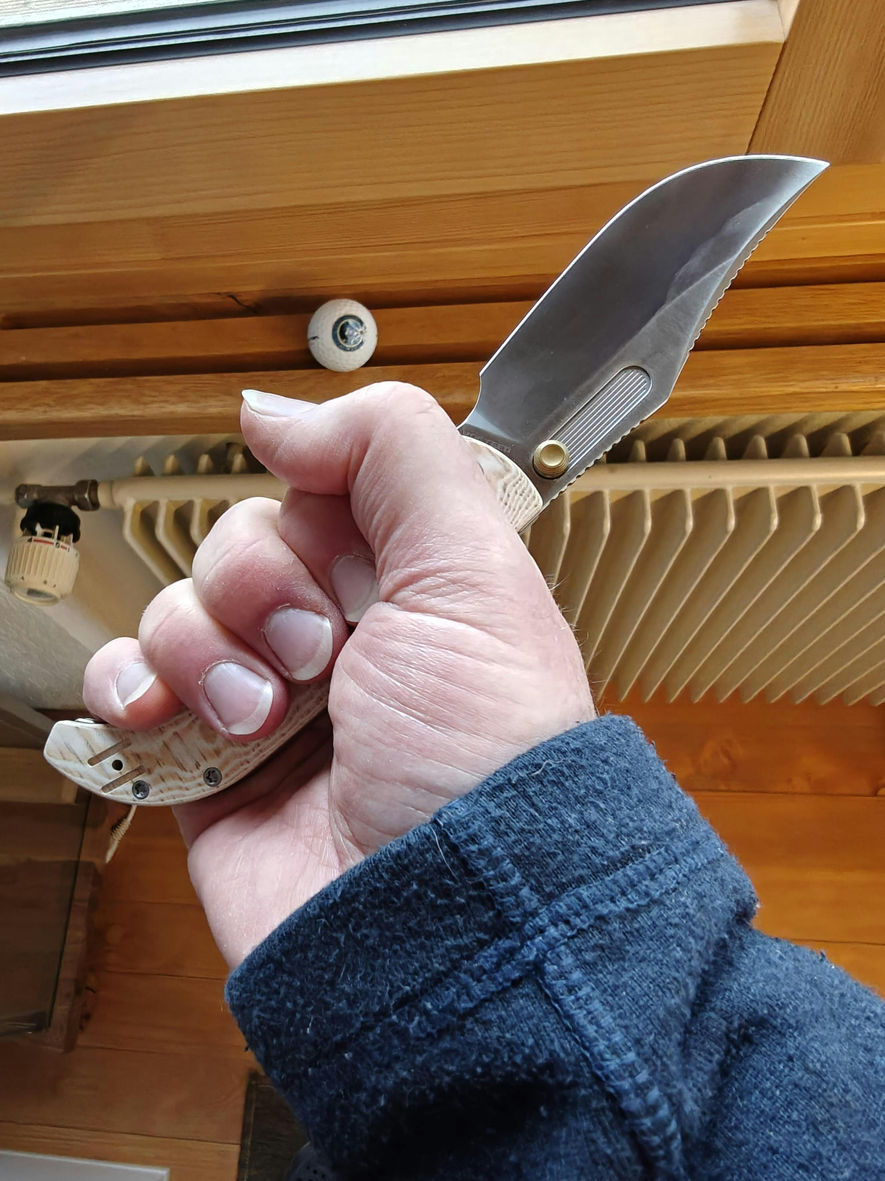 I find this a very handsome designed pocket knife. It fits like a glove in my hand and looks different from the normal designs. The mechanism works flawlessly for opening and closing with one hand. The clip for the pocket is very tight at the moment. I'm sure it will soften with age! I like the two notched areas on the back of the blade. One close to the thumb for extra cutting strength and one above the curved point of the blade for fine carving. I got it at a good price during black weekend! Very pleased!!