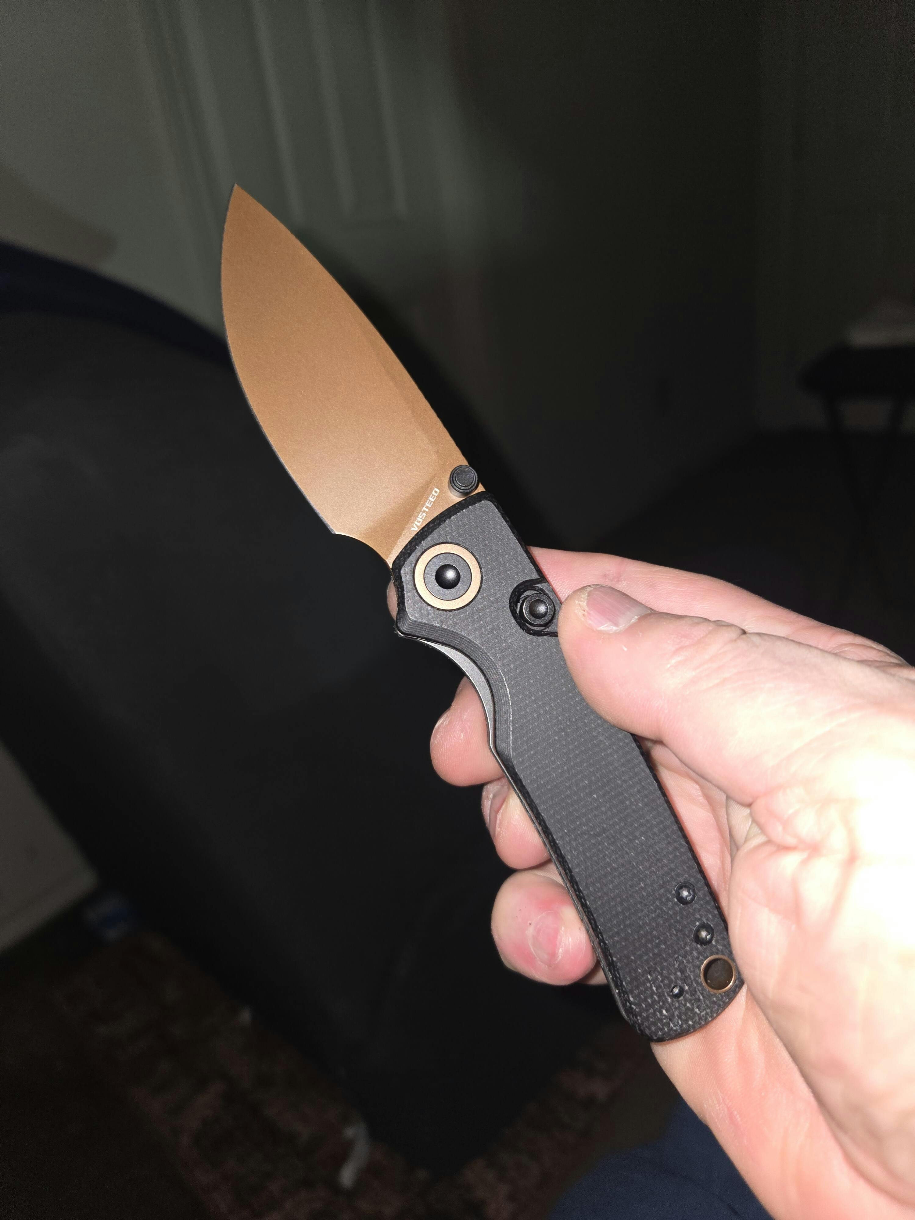 This is an amazing knife for the price, huge value! Great ergonomics, gimping, lock mechanism, good blade and handle material, and love the thumb stud version! I had previously ordered the thumb hole version, and had difficulty with the finger flick, due to large hands, but this thumb stud version works perfect 👌 Great job Vosteed crew! Keep it going👍🏻